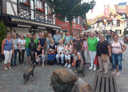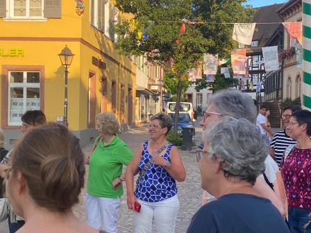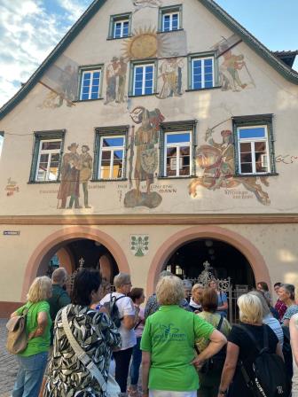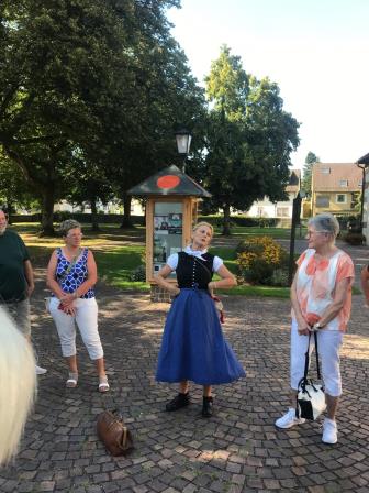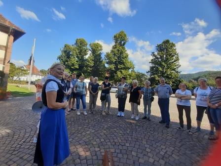 Die Hebamme führte die Landfrauen vom alten Kapuzinerkloster vorbei an der Statue von Hansjakob durch Haslachs Handwerkerviertel zum Marktplatz mit historischem Rathaus.