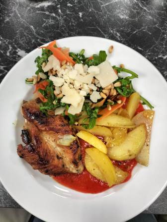 Als Hauptgang bereiteten die Männer Hühnerbrüstchen mit Paprikamus und Backofenkartoffeln zu.