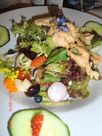 Nachher genossen wir in der hauseigenen Kantine die wunderbare Salatkombination mit frischen Früchten, Blüten und Holunderbeerdressing an gebratenen Putenstreifen.