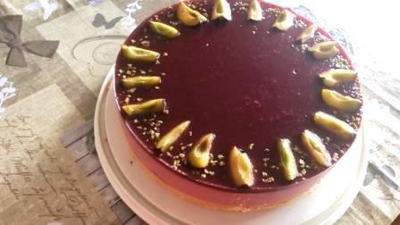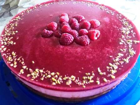Mit frischen Himbeeren und Minzblättchen oder geh. Pistazien verzieren. Diese Torte kann auch sehr gut mit Erdbeeren oder anderem Obst zubereitet werden. Ich habe sie mit Zwetschgen probiert, auch lecker. Hier hab ich die Zwetschgen einfach entsteint und mit dem Mixer püriert.