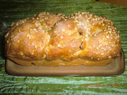 Den Teig in drei Teile teilen und gleich lange, starke Stränge formen. Zu einem Zopf flechten. Das Ganze in eine gefettete Kastenform geben und nochmals gehen lassen. Mit verquirltem Eigelb bestreichen und mit Hagelzucker und Mandelstückchen bestreuen. Ergibt 2 Zöpfe für eine Kastenform mit 25 cm oder einen großen Zopf auf einem Backblech.