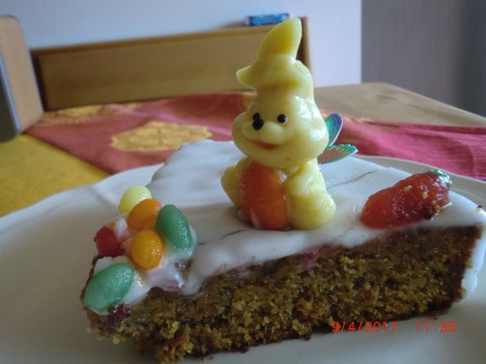 Abkühlen lassen und nach Belieben dekorieren. Ich habe diesen Kuchen als Ostertorte dekoriert, er ist sehr saftig und hält sich einige Tage lang gut.