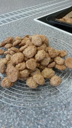 Mit einem Teelöffel auf ein mit Backpapier ausgelegtes Backblech kleine Häufchen setzen, nicht so dicht nebeneinander, da die Kekse etwas auseinanderlaufen.