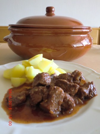 mit Rotwein auffüllen, bis das Gulasch ganz bedeckt ist. Topf mit einem Tondeckel oder mit Alufolie verschließen und in den auf 250 Grad vorgeheizten Backofen stellen.